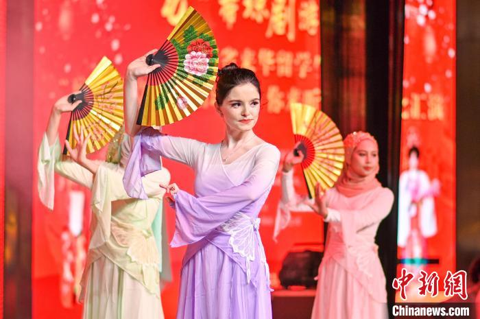 1月22日晚,海南省來華留學(xué)生“瓊韻華章之瓦唱瓊劇、你來聽”非遺匯演在海口舉行,外國留學(xué)生表演折扇舞。 肖若洋 攝