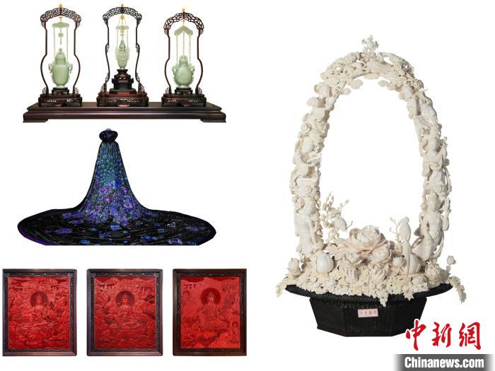 《纏枝蓮紋吊鏈瓶》(玉雕)、《四海升平》(牙雕)、《碧泓云想富貴長天錦繡雀裘》(京繡)和《雕漆剔紅法海寺壁畫》(雕漆)四件作品被認定為北京傳統工藝美術珍品。 主辦方供圖