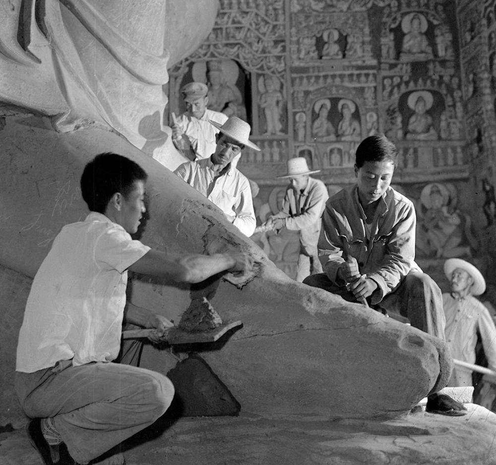 工人們在修補石佛(資料照片)。